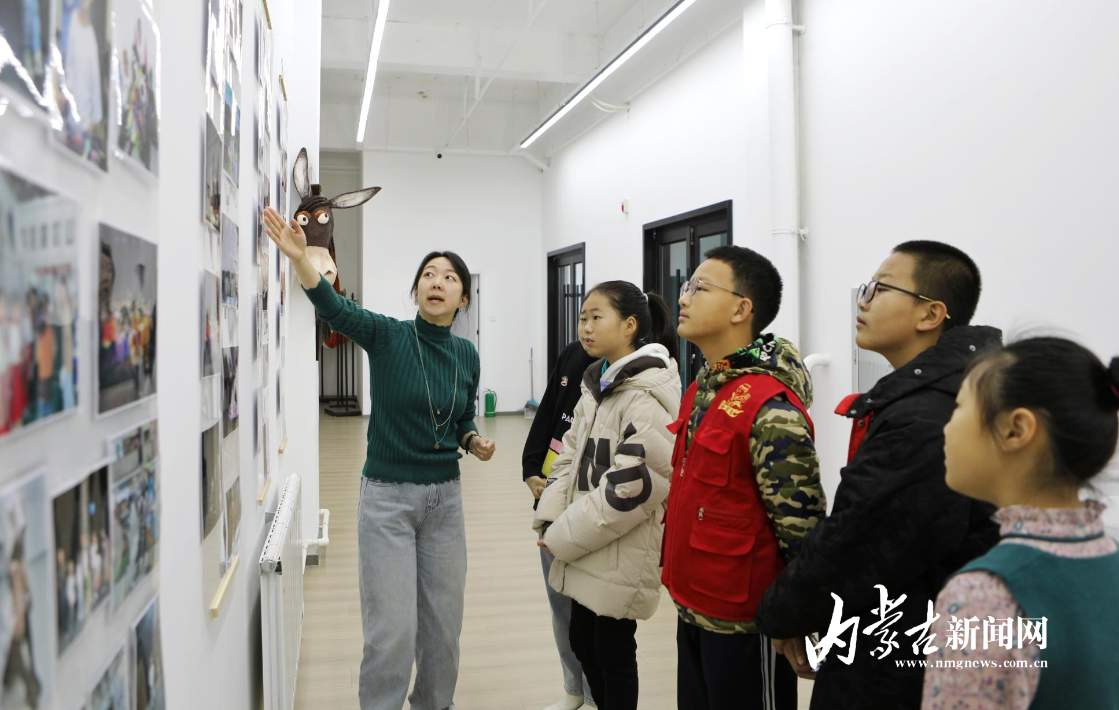 “這是排練室,這些道具是我們和小朋友一起動(dòng)手制作的……”內(nèi)蒙古新思路文化藝術(shù)培訓(xùn)中心作為兒童音樂劇《十二生肖“斗天狗”》的創(chuàng)排方,工作人員胡亞敏帶領(lǐng)小記者們參觀中心的文化墻和排練廳,瀏覽歷年來優(yōu)秀劇目和演出的精彩瞬間,讓大家感受濃厚的藝術(shù)氛圍,近距離觸摸觀賞演出道具,對(duì)兒童劇有更直觀認(rèn)識(shí)。