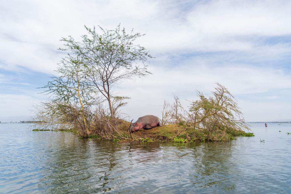 ↑在肯尼亞納庫魯郡,一只河馬在奈瓦沙湖中一座小島上休息(2月1日攝)。