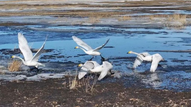 春日的輝河濕地,冰雪初融,碧波漾漾,澄澈的水域與新生的植被交相輝映。作為呼倫貝爾草原東部最大的一條沼澤、湖泊型帶狀濕地,這里是候鳥北遷途中不可或缺的停歇驛站與天然補(bǔ)給秘境,承載著呼倫貝爾守護(hù)生物多樣性的重要使命。此次翩然而至的七只天鵝,身姿綽約,體態(tài)優(yōu)雅,或曲頸頷首啄食淺灘嫩草,或振翅翩飛掠過粼粼波光,腳掌輕劃碧波,漾開圈圈漣漪,為廣袤無垠的呼倫貝爾草原濕地,綴上了春日里最鮮活的一抹亮色。